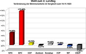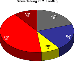 | 5. November 1922, Wahl zum 2. Landtag | | Stimmen | Sitze | überhaupt | v.H. | überh. | v.H. | Wahlberechtigte | 3.117.487 | 66,85 | | WählerInnen | 2.549.968 | | Wahlbeteiligung | | 81,80 | ungültige Stimmen | 12.385 | 0,49 | gültige Stimmen | 2.537.583 | 99,51 | 96 | | davon: | Vereinigte sozialdemokratische Partei Deutschlands | 1.060.247 | 41,78 | 40 | 41,67 | Deutschnationale Volkspartei | 482.469 | 19,01 | 19 | 19,79 | Deutsche Volkspartei | 474.708 | 18,71 | 19 | 19,79 | Kommunistische Partei Deutschlands | 266.864 | 10,52 | 10 | 10,42 | Deutsche demokratische Partei | 214.189 | 8,44 | 8 | 8,33 | Zentrum | 22.611 | 0,89 | - | - | Deutsche soziale Volksgemeinschaft | 11.358 | 0,45 | - | - | Wirtschaftspartei | 5.137 | 0,20 | - | - |